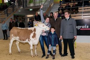 Julia BAyer freut sich mit Obmann Johann Derler und Zuchtleiter Franz Pirker über den Gewinn der Kalbin © Fritz Baumann