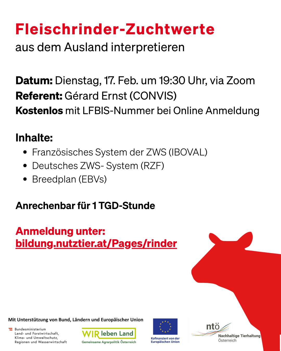 Bei den spezialisierten Fleischrinderrassen wird regelmäßig Genetik aus dem Ausland eingesetzt. Daher ist es hilfreich, die Zuchtwertschätzungen der jeweiligen Herkunftsländer zu kennen. Gérard Ernst ist beim luxemburgischen Zuchtverband CONVIS für internationale Beratung zuständig und verfügt über einen umfassenden Einblick in die europäische Fleischrinderzucht. In diesem Webinar erklärt Gérard Ernst die Zuchtwertschätzungssysteme in Frankreich (das auch […]